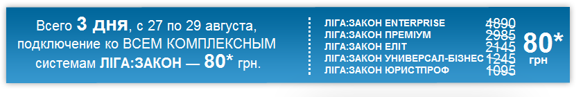 В преддверии нового бизнес-периода компания"ЛІГА:ЗАКОН" объявляет о запуске всеукраинской акции:только 3 дня, с 27 по 29 августа, можно приобрести ЛЮБУЮ комплексную систему ЛІГА:ЗАКОН по невероятно выгодной цене.