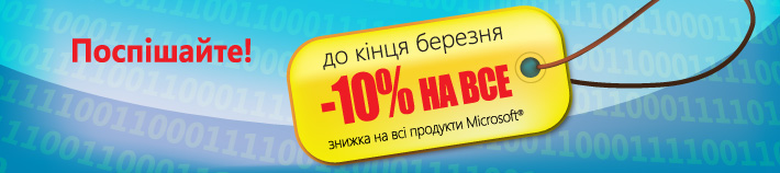Лише з 5.03.2010 по 31.03.2010 року по всій Україні буде діяти промо для замовників малого та середнього бізнесу** — знижка 10% на всі* продукти Microsoft за програмами корпоративного ліцензування. Не пропустіть чудову можливість легалізувати IT-інфраструктуру бізнесу та підвищити його продуктивність, використовуючи переваги продуктів Microsoft. Пропозиція не поширюється на академічних та державних замовників, а також на спеціальний рівень цін С.